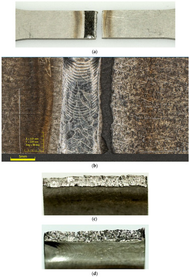 Despite the precise plasma arc of microplasma arc welding, the adverse effect of welding heat seems to negatively impact the titanium Grade 5 joints. The location of the cracks and fractographic observations further strengthens this conclusion. Figure 10 and Figure 11 present the macroscopic structure of the welds before fatigue tests. From the images, an obvious discolouration around the welds can be observed, which roughly corresponded with the HAZ. Additionally, closer inspection of the surface of the weld bead displayed faint cracks. Since the weld beads were shielded during and after welding, it is presumed that the cracks were formed during rapid cooling of the weld. The fatigue fractures for the analysed types of joints, obtained for a load corresponding to 0.82 , are presented in Figure 12 and Figure 13. The surfaces of fatigue fractures of welded joints run macroscopically perpendicular to the direction of the load. For the analysed joints, fatigue cracking occurred on the surface of the element in the transition line of the weld face to the welded material, from where the cracking developed. Fatigue fractures have a multi-surface structure with visible focal points. They are responsible for stopping the cracking process or its slowdown as a result of changing load conditions. As the number of load cycles increases, the cracks spread and merge into clusters, creating fatigue breakthrough zones. The progressive development of the crack causes a weakening of the sample cross-section, which will lead to its rapid failure.