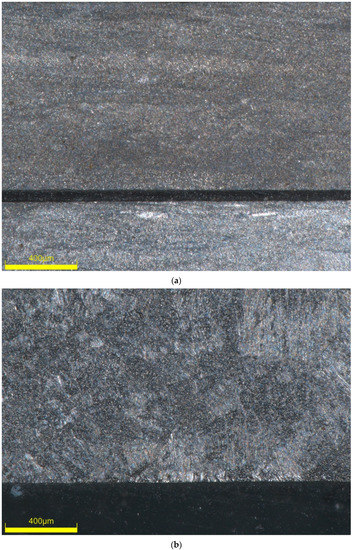 Moreover, the Vickers method was used to measure the hardness of titanium welded joints in multiple locations of the specimens. Sinowon Vickers Hardness Tester HV-50A (DongGuan, China) with a 5 kg indenter load was used to perform the hardness tests. The measurements were carried out on the unaffected base metal (UBM), in the heat-affected zone (HAZ) and in the centre of the weld (W). Hardness measurements were carried out for both welded sample types. Table 4 presents the results of the hardness tests which are the arithmetic mean of the three different measurements from each location.