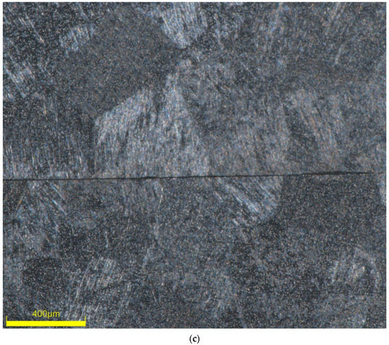 Characteristic microstructures of joints were presented on the cross-section of the tested joints in the form of micrographs at ×30 magnification (Figure 16) and ×145 magnification (Figure 17). Even a quick investigation of welded joints (Figure 16b,c and Figure 17b,c) showed a distinct change in the microstructure of the material. In both welded samples, grain sizes observably increase at the weld beads and gradually decrease along HAZ. This explains the substantial change in the mechanical behaviour of the material both during monotonic and fatigue tests. As expected, increase in the grain size is much more prominent in Type 3 samples (Figure 16c and Figure 17c) due to the increased heat required for a successful fusion. Moreover, microstructural observations show inconsistencies in grains and grain sizes in the HAZ and near-HAZ of welded samples, compared to the relatively homogenous structure of the sample without welds. For Type 2, the effect of HAZ can be observed at the right side of the image (Figure 16b). As for Type 3 samples, showing HAZ alongside unaffected base metal on a single image at this magnification is not possible as it spans the entirety of the image (Figure 16c), which also points to the increased HAZ for Type 3 samples.