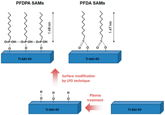 Schematic illustration of the modification processes leading to the creation of 2H,2H,3H,3H-perfluoroundecanoic acid (PFDA) and 1H,1H,2H,2H-perfluorodecylphosphonic acid (PFDPA) self-assembled monolayers (SAMs) on Ti-6Al-4V surfaces. LPD: liquid phase deposition.