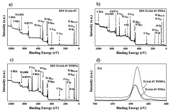 XPS spectra of the Ti-6Al-4V surface before and after modification: (a) Ti-6Al-4V substrate, (b) PFDA modification, (c) PFDPA modification, and (d) F 1s1/2 peak of fluorine identified in both SAMs.