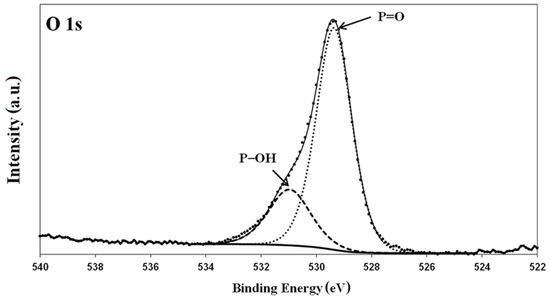 In the case of phosphonic acid (PFDPA), Brodard-Severac et al. [45] indicated that the presence of three oxygen atoms allows for mono-, bi-, and tri-dentate binding with the metal surface. In the case of mono- and bi-dentate binding, the remaining groups (P–OH and P=O) most likely create hydrogen bonds with neighboring phosphonate compounds. Their presence is important because hydrogen-bonding interactions cause stabilization of the monolayer. In this study, for the surface modified by PFDPA, the P=O stretching vibration was manifested as an intense peak on the FTIR spectrum at 1212 cm−1. Therefore, the IR characterization suggests that phosphonic acid cannot form tridentate binding with a surface of Ti-6Al-4V. The bands at 1126 and 1160 cm−1 corresponded to P–OH stretching vibrations, whereas the peak characteristic for the P–O vibrations was clearly visible around 1100 cm−1. This was also confirmed by the XPS analysis. The high-resolution O 1s XPS spectra obtained for the PFDPA SAMs on the Ti-6Al-4V substrate are shown in Figure 5. In the literature, the binding energy values for P=O and P–O groups in phosphonic acids are 530.8–535.0 eV and 529.4–533.6 eV, respectively, whereas the separation between the components is fixed at approximately 2 eV [46,47,48]. The presence of both peaks in the spectrum and relatively low intensity of the P–OH peak indicated that the phosphonate was bound to the oxide surface through monodentate binding [44,49]. In turn, the high intensity of the peak derived from the P=O groups shows that it did not take part in the formation of binding to the Ti-6Al-4V surface. In Figure 5, two peaks derived from the P–OH and P=O bonds were clearly visible. Moreover, the high intensity of the P=O peak indicated that this group did not participate in the bond formation with the alloy surface, which excluded the formation of a tridentate bond. Moreover, the presence of a peak derived from the P–OH bonds in the XPS spectrum indicated that it was also not involved in the formation of a bond between the compound and the surface. On this basis, it can be concluded that the monodentate bond was produced by the modification of Ti-6Al-4V with PFDP acid.