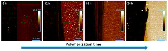AFM topography images at the edge of the scratches performed in poly(methyl methacrylate) (PMMA) brushes obtained after different times of surface-initiated photoinduced iron-catalyzed atom transfer radical polymerization (SI-photo-Fe-ATRP) in the presence of the sacrificial initiator.