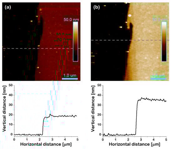 The AFM topography images of the obtained samples (Figure 1) confirmed the formation of continuous and homogenous films. The bright spots on topography images indicate deposition of some physically adsorbed macromolecules and/or covalently attached chains from a solution via locally occurred recombination reactions. The brush grafting density (Σ) was calculated in two ways: (1) using Mn values of free polymers in solution (Mn = 20500, Mw/Mn = 1.55 Table 1 entry 5) obtained by GPC measurements (Equation (1), ΣGPC) and (2) by determining the swelling ratio (α = hwet/hdry) of PMMA brushes in the good solvent—toluene (Equation (2), Σα), according to the methodology described previously [38].