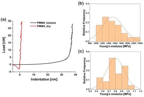 Exemplary AFM nanoindentation curves of (a) PMMA in the air and toluene with histograms showing distribution of calculated Young’s moduli for (b) PMMA brush in the air and (c) the same brush immersed in toluene.
