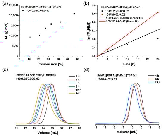Results of syntheses of PMMA polymers in the solution by means of photo-Fe-ATRP: (a) number-average molecular weight (Mn) vs. conversion, (b) semilogarithmic kinetic plots, (c,d) gel permeation chromatography (GPC) chromatograms.