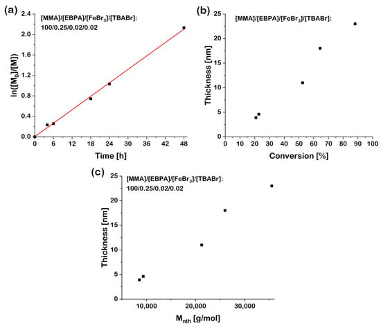 Results of syntheses of PMMA brushes by means of SI-photo-Fe-ATRP with sacrificial initiator: (a) semilogarithmic kinetic plot for synthesis of PMMA brushes (based on 1H NMR analysis of polymerization solution after SI-photo-Fe-ATRP), (b) thickness vs. monomer conversion (calculated based on 1H NMR analysis of polymerization solution after SI-photo-Fe-ATRP), and (c) thickness vs. theoretical number-average molecular weight.