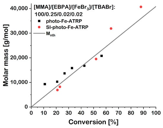 Plot presenting dependency of estimated Mα of grafted PMMA brushes and Mn of PMMA polymers obtained in solution during photo-Fe-ATRP vs. monomer conversion (conversions calculated by means of 1H NMR).