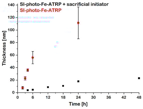 The comparison of the kinetics of SI-photo-Fe-ATRP with and without sacrificial initiator revealed substantial differences in the polymerization rate (Figure 7). Around 10 times thicker layers were obtained during the first 6 h of reaction in case of polymerization without sacrificial initiator compared to the reaction with EBPA (Figure 7). The in situ generation of ATRP initiator (2,3-dibromoisobutyrate) during photoreduction of FeBr3/TBABr in the presence of MMA helps to maintain the control by initiation of polymerization in the solution and hence regeneration of the deactivator. As a result, the simplified reaction system could be used with ppm amount of the catalyst without free initiator in the solution. It is worth emphasizing that the developed conditions enable the formation of very thick layers of PMMA brushes at room temperature, which is of great importance as such materials are commonly synthesized at elevated temperatures [38,47,48].