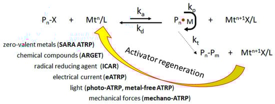 The controlled character of ATRP is based on activation and deactivation of the growing radicals, which is realized by reversible halogen transfer from initiator to activating complex [9]. The classical ATRP requires the use of substantial amounts of catalyst to maintain the control over the reactive radicals. However, most of biological and electronic applications are highly restricted to the presence of impurities coming from transition metals. Therefore, significant scientific efforts have been devoted to development of new ATRP techniques, in which concentration of transition metal complex is greatly limited, due to regeneration of activator by the use of: radical chemical reducing agent in initiators for continuous activator regeneration (ICAR) ATRP [10], chemical reductants in activators regenerated by electron transfer (ARGET) ATRP [11], zero-valent metals in supplemental activator and reducing agent (SARA) ATRP [12], electrochemical reactions in electrochemically mediated ATRP (eATRP) [13], light in both metal-free [14] and photoinduced ATRP (photo-ATRP) [15], or mechanical forces in mechanically induced ATRP (mechano-ATRP) [16] (see Scheme 1). Moreover, copper catalysts could be effectively replaced by iron compounds because of their lower toxicity and costs [17].