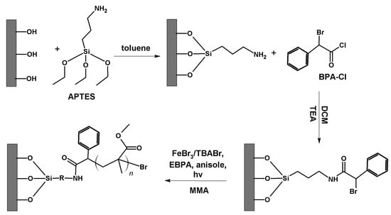 Silicon wafers were obtained from ON Semiconductor (Roznov, Czech Republic). Hydrogen peroxide (30%, p.a.), sulfuric acid (96%, p.a.), hydrochloric acid (35–38%, p.a.), toluene (p.a.), tetrahydrofuran (THF, p.a.), dichloromethane (DCM, p.a.), ethanol (p.a.), and methanol (p.a.) were purchased from Chempur (Piekary Slaskie, Poland). In addition to this, (3-aminopropyl) trimethoxysilane (APTES, 99%), α-bromophenylacetyl chloride (BPA-Cl, technical, 80%), triethylamine (TEA, puriss. p.a., ≥99.5%, GC), ethyl α-bromophenylacetate (EBPA, 97%), and methyl methacrylate (MMA, 99%, ≤30 ppm MEHQ as an inhibitor) were purchased from Sigma Aldrich. Anisole (>99%), tetrabutylammonium bromide (TBABr, 99%) were purchased from Fluorochem (Hadfield, UK). Iron (III) bromide (FeBr3, anhydrous, >98%) was obtained from Alfa Aesar and stored in an argon atmosphere. MMA was passed through the basic alumina column to remove inhibitors before the polymerization, while anisole was passed through a neutral alumina column and dried over molecular sieves under argon atmosphere. Rest of chemicals were used as received.
