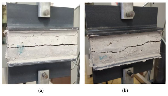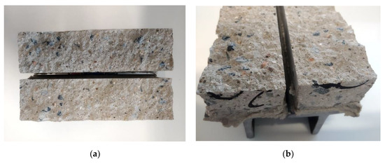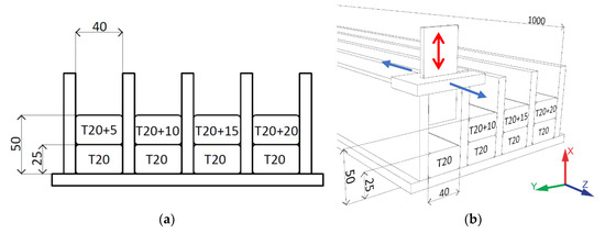 It was necessary to cut four initial precast concrete elements with dimensions of 50 × 40 × 1250 mm3 into twenty specimens with dimensions of 50 × 40 × 150 mm3. The cross-section of concrete blocks (40 × 50 mm2) was selected to simulate two concrete layers produced using 3D concrete printing technology with nozzle dimensions of 25 × 40 mm2. Subsequently, steel T-profiles were glued to the top and bottom of each block with the epoxy glue Sikadur-31 EF (Sika AG, Baar, Switzerland) with a tensile strength of 20 N/mm2 after 3 days of drying at a temperature of +23 °C [14].