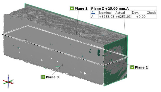 Each specimen was optically scanned after being cut off from the concrete element. The optical properties (surface matt and reflection) meant that the specimens were suitable for direct scanning, where coating of the surface with TiO2 was not required [13]. The boundary of deposited layers was measured from the bottom of the concrete elements. The three planes were fitted onto the bottom, left, and right side of the specimen using the Gaussian best fit method with the use of Three-sigma rule (i.e., three standard deviations). After that, the specimen was aligned into the local coordinate system. The Z-axis coordinate of the interface area (Figure 3) was set as 25 mm from the bottom plane, and to define the exact area, the single-section function was used. After this, the cross-sectional area was measured by the area analysis function (Table 3).