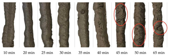 Figure 6. Quality of the single-layer extrusion: observation of the fluid consistency of extrusion from 10 min after mixing and crack occurrences from 45 min after mixing.