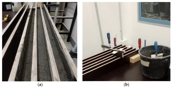 For the deposition of concrete, the forms and trowel with adjustable heights were built (Figure 7). The deposition of each first layer was done 20 min after wet mixing (denoted as T20) and trowelled at a height of 25 mm. The deposition of the second layer was conducted at a 5 min interval after 20 min of wet mixing (Figure 2a) and troweled at a height of 50 mm. The troweling of layers was equal to the nozzle movement with a velocity of approximately 10 mm/s for the 3DCP process. After the layer deposition, the concrete elements in the forms were covered by wet textile and plastic foil to preserve the microclimatic conditions at an ambient temperature (23.7 ± 2 °C).