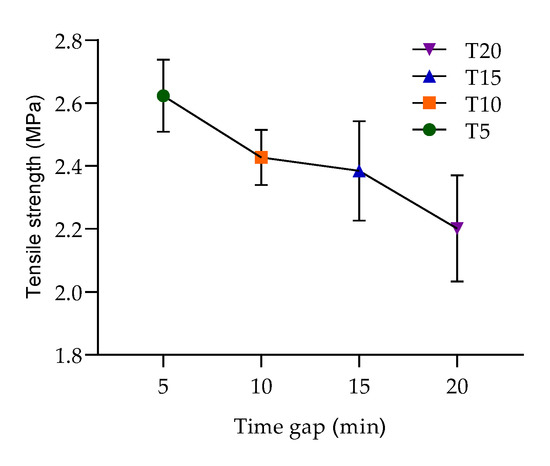 The values show that the interface strength of the deposited layers was significantly influenced by the delay time used for the layer deposition. The interface strength was strong at 5 min, and from this delay time, there was a decreasing trend between specimens deposited at 10 and 15 min, where a small fluctuation was measured (Figure 8). A similar trend can be observed in the study by Panda et al. [17]. This also partially matched the observations of another study, where the authors proclaimed that, generally, regarding printing speed, the interface strength decreases when the time gap between two layers increases, and the interface strength is stronger in specimens printed at a lower speed [18]. In this study, a constant speed was used for all mixture deposition processes with different time delays. This helped to avoid undesirable roughness manipulation of the upper surface of a deposited layer due to the speed of the nozzle. This process avoided the deformation of the printed layers due to the method used for deposition into the form. This method enabled reaching a more accurate result with a lower variance in the data for this specific mixture, and its was more likely that a similar trend would be observed for 3D-printed specimens. Note that Rubio et al. found that heterogeneity was induced by 3D printing through extrusion/deposition based on the density of mortars. The density of the upper layers was lower than that of the bottom layers after the deposition/printing. This means that lower layers began to consolidate. This phenomenon of consolidation has a direct impact on the resistance levels [9] and requires more comparative investigations to characterize this impact.