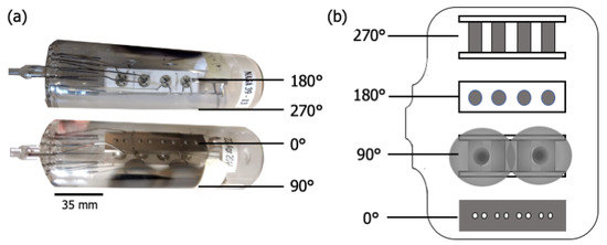 (a) Photographs of the scandate cathode test vehicle, comprised of a glass envelope containing the cathode assembly, and (b) an “unrolled” schematic highlighting different views around the circumference of the envelope.