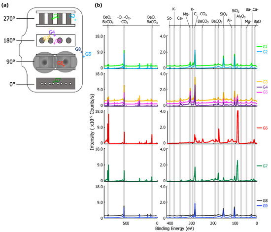 The location of each point scan is indicated in Figure 3a. G7 is above the cathodes opposite the anode plate, which has pinholes with ~0.5 mm diameters directly in line with the cathodes (see Figure 1 and Figure 2). G1 and G2 are adjacent to the cathode assembly, and G6 is within the Ba-Al flash region. G3, G4, and G5 are behind the cathodes (see Figure 1). G8 is a reference interior point opposite the sealed opening, and G9 is a similarly located exterior reference. Peak binding energies, background-deducted counts, S/N ratios, spectral lines, and species identification for each position can be found in tables located in the Appendix A.