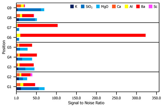S/N ratios for each relevant peak presented in Figure 3. For elements correlated to multiple peaks, the peak with the greatest height is included. For each position, the top bar is composed of elements found in the impregnate (Ca, Al, Ba, and Sc) and the bottom bar comprises elements found in the glass substrate (K, SiO, and MgO).