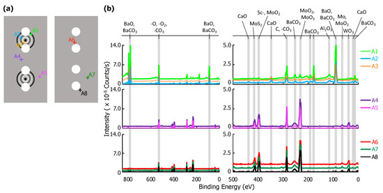 XPS results for eight point scans on the anode—five on the cathode-facing side, A1–A5, and three on the opposite side, A6–A8—are shown in Figure 5. The location of each point scan is indicated in the diagram included as Figure 5a, and the two columns of spectra in Figure 5b are as described above for the glass envelope. Arbitrary vertical shifts were applied to improve readability. The eight point scans can be separated into three groups: A1, A2, and A3 are all located on discolored rings discernible on the cathode-facing anode surface (Figure 2). A4 and A5 are also on the cathode-facing side of the anode, but away from discolored rings. A6, A7, and A8 are distributed across the back of the anode, which directly face the glass envelope. Peak binding energies, background-deducted counts, S/N ratios, spectral lines, and species identification for each position can be found in tables located in the Appendix A.