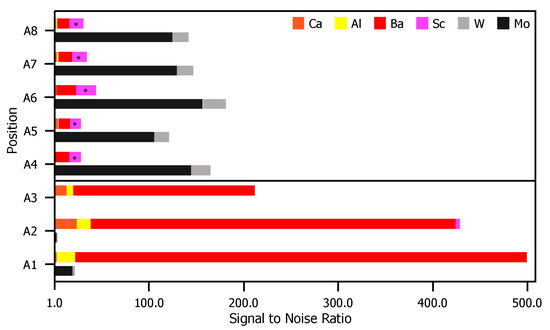 S/N ratios for each relevant peak in Figure 5. For elements correlated to multiple peaks, the peak with the greatest height is included. For each position, the top bar is composed of elements found in the impregnate (Ca, Al, Ba, and Sc) and the bottom bar comprises elements found in the anode substrate (Mg and W).
