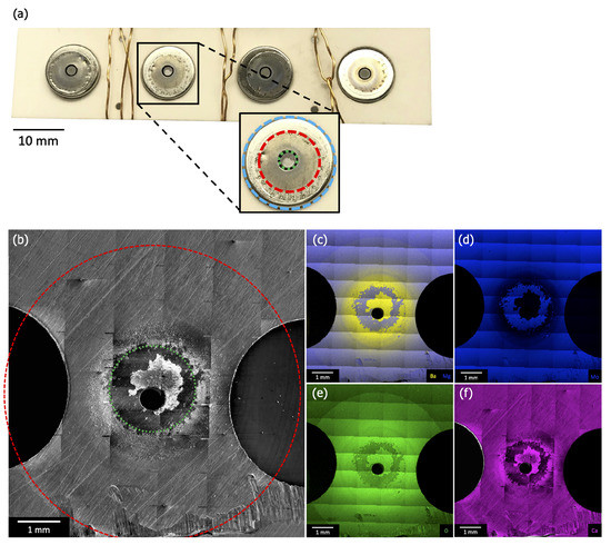 (a) A photograph of the cathode assembly before removal of the cathodes but after removal of the anode. This image shows the ceramic spacer penetrated by the cathode housings (blue ring in “zoom-in”) and the cathodes visible through holes in the housing (green ring in “zoom-in”, ~2 mm in diameter). (b) Plan-view SEM and (c–f) EDS maps of Ba/Mg, Mg, O, and Ca from one of the discolored regions of the anode that were observed directly opposite a cathode’s emitting surface (Figure 2). Each image is comprised of multiple scans combined to produce a large area image, allowing for examination of the entire deposition region (red ring in (b) and “zoom-in”, ~6 mm in diameter).