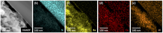 Compositional analysis of the deposit/substrate interface at G6 on the glass envelope. (a) High-angle annular dark-field (HAADF) results show a poorly adhered porous layer (bottom left of image) atop a smooth glass substrate (upper right). (b–e) Elemental mapping shows the distribution of Si, Ba, Ca, and Al within the deposit and substrate.