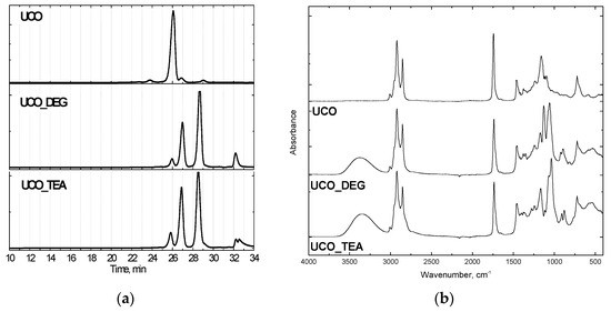 The bio-originating polyols were synthesized from used cooking oil following the transesterification method with diethanolamine (UCO_TEA) and diethylene glycol (UCO_DEG) at Cracow University of Technology. The reagents were introduced with a molar ratio of 1:3 (waste oil: transesterification agent). The reaction was carried out at a temperature of 175 °C and the catalyst content (zinc acetate) was 0.3 wt.%. The reaction product consists of monoglycerides, diglycerides and triglycerides (Figure 1a). Used cooking oil was amassed from restaurants. The GPC (, Warsaw, Poland) -based chromatograms showed characteristic peaks of triglycerides (26 min), diglycerides (27 min) and monoglycerides (29 min). Additionally, the FTIR (Perkin Elmer, Waltham, MA, USA) analysis attested to the chemical structure of the bio-polyols. The broad band at 3340–3390 cm−1 corresponded to free hydroxyl groups in the polyols (Figure 1b). PCC Rokita SA provided petrochemical polyether polyol, and the hydroxyl value of this material was 440 mgKOH/g.Polymeric methylene diphenyldiisocyanate (Ongronat 2100), with a free isocyanate groups content of 31.5 wt%, was offered by Borschodchem. Evonik supplied catalysts for the foaming (dimethylaminoethoxyethanol) and gelling (dibutyltin dilaurate) reactions and also a surfactant. The reaction of water with isocyanate groups generated carbon dioxide, which served as a chemical blowing agent. The content and isocyanate index of each component are shown in Table 2.