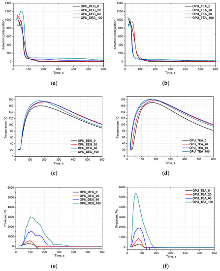 Bio-polyols UCO_DEG and UCO_TEA with different contents and their influence on on dielectric polarization (a,b), temperature (c,d) and pressure (e,f) of reaction mixtures.