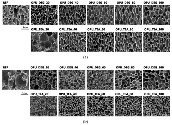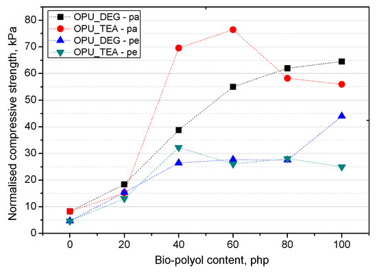 On the basis of the normalized values of the compressive strength, it can be stated that when the petrochemical polyol was replaced with either type of bio-polyol, a beneficial effect was observed. An increase of the compressive strength was observed especially for the samples modified with 40–60% of the OPU_TEA bio-polyol. However, if the mechanical properties were measured in a more critical direction (perpendicular to the foam rise direction) the most favorable properties were obtained for the materials modified with 100% of the UCO_DEG bio-polyols. The mechanical properties perpendicular to the foam growth direction are very important due to their close correlation with the foam’s dimensional stability.