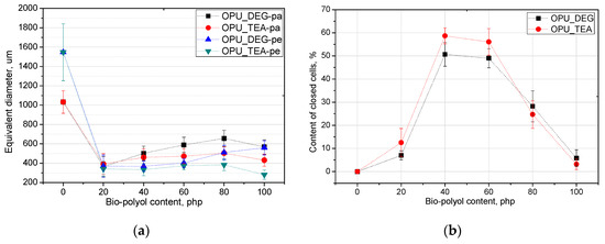 Equivalent diameter (a) and closed cell content (b) of bio-foams altered with bio-polyols in different amounts.