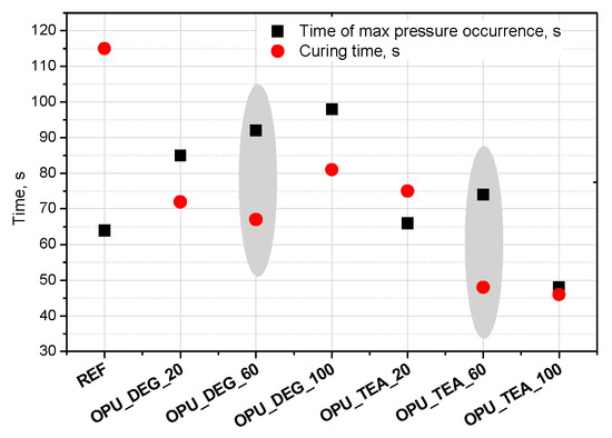 Curing time is evaluated from the dielectric polarization curve. It was found that in the case of the materials with a 60% content of the bio-polyol in the premix (regardless of its type), the greatest difference between these times was observed (Figure 5). The time of curing was significantly shorter compared to the time of maximum pressure, which made it difficult to open the cells in the cross-linked foam. However, in the case of the reference foam this effect was not observed. This may be due to the irregular cellular structure (large cells), which caused inaccurate adherence to the measuring device.