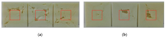 The thermal conductivity depends strongly on the average temperature of the measurement. The higher the temperature, the higher the conductivity coefficient. Generally, producers of PUR foams provide the value of the thermal conductivity coefficient at an average temperature of 10 °C. All the foams modified with the UCO_TEA bio-polyol have thermal conductivity values comparable to those of commercial foams [3]. This is associated with the cellular structure of the foams based on bio-polyol UCO_TEA, which is characterized by a low equivalent cell diameter. In this work, it was confirmed that the reduction of the cell diameter reduced the thermal conductivity of open-cell foams. Until now, such a relationship has been described in the literature for closed-cell foams [25]. Piszczyk et al. concluded that a change in the pore diameter from 0.25 to 0.6 mm increases the value of thermal conductivity coefficient by almost 50% [24]. It was also observed that material OPU_DEG_40 had the highest coefficient of thermal conductivity. This effect is a result of a disturbance in the foam structure probably due to the addition of this bio-polyol. A similar disturbance was also observed in the case of the material modified with 20% of the OPU_DEG bio-polyol. Such effects could be caused by insufficient miscibility of the polyols used in the polyol premix. The more favorable thermal conductivity coefficient for the OPU_DEG_20 foam compared to the OPU_DEG_40 foam, despite the disturbances in the foam structure, resulted from the methodology of measuring the heat conductivity coefficient. The measurement was performed on the central surface of the material (as marked with a red square) and resulted from the specificity of the device used (Figure 6). In the case of the UCO_DEG_20 foam, despite the defects, the thermal conductivity coefficient had a favorable value due to the regular structure in the middle of the material. However, in UCO_DEG_40, the defect was within the measurement area in two out of the three foams, hence the much higher value of the standard deviation.