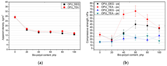 Influence of bio-polyols and their content on apparent density (a) and compressive strength (b) of modified foams.