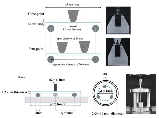 Schematic diagram of the equipment used in each bending test. Upper: Three-point bending test, Middle: Four-point bending test, Lower: Biaxial bending test.