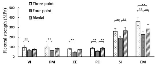 The average flexural strength is shown in Figure 2. The SI and EM of Li2O5Si2 showed a higher flexural strength in the three-point bending test, whereas the four-point bending test showed the smallest flexural strength among all the test methods in all materials. The order of the mean value in all materials was the three-point bending test ≥ biaxial flexural test > four-point bending test, with no significant differences between the test methods except for some products. Significant differences (p < 0.01) were observed in all materials when comparing the three-point and four-point flexural strength. In comparison with the four-point and biaxial flexural strength, a significant difference (p < 0.01) was observed in PC, SI, and EM. However, no significant difference was observed in the VI, PM, and CE groups (p > 0.05). There was no significant difference in the VI, PM, and CE (p > 0.05). Figure 3 shows the correlations among the test methods using the flexural strength obtained. High determination coefficients were found in all combinations of test methods. In particular, the highest determination coefficient was observed between the three-point and four-point flexural strength.