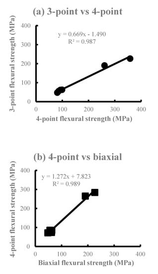 The measurements for each test were dependent on the size of the sample and decrease with an increase in volume. In particular, the measured values of the biaxial bending sample are smaller compared to those of the three-point bending sample. This indicates that the strength of ceramics is directly affected by the size and distribution of defects, which are the starting points of failure. However, the Weibull analysis results indicate that the m ranges from 3.84 to 16.3, indicating no particular change in the failure mode [21,22]. The Weibull characteristic strength (S0), which is the strength occurring at a failure probability of 63.2%, showed the same trend as the average flexural strength, but was larger than the average value (Table 3). There was no significant difference in the m of the biaxial flexural strength of the DPCs, and the 95% confidence interval was the narrowest. Although the values were slightly different for each test method and specimen shape, there was no significant difference between the methods in the m. Therefore, the m, which indicates the magnitude of the change in intensity, might not depend on the specimen volume. Moreover, it was found that the biaxial bending test was as reliable as the other tests in DPCs. The results of the regression analysis using S0 for the combination of the four-point and biaxial flexural strength showed the highest values.