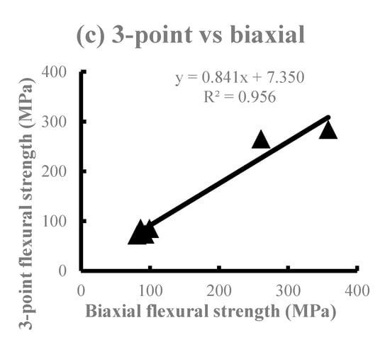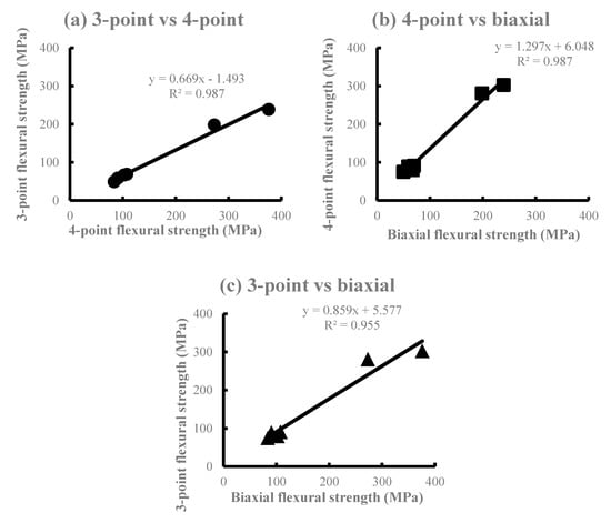 The correlations between the average flexural strength of the three test methods. (a) 3-Point vs. 4-point, (b) 4-point vs. biaxial, (c) 3-point vs. biaxial.