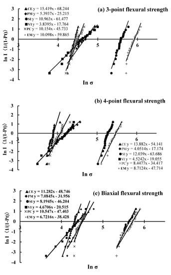 Weibull plots for each test. (a) 3-Point flexural strength, (b) 4-point flexural strength, (c) biaxial flexural strength.