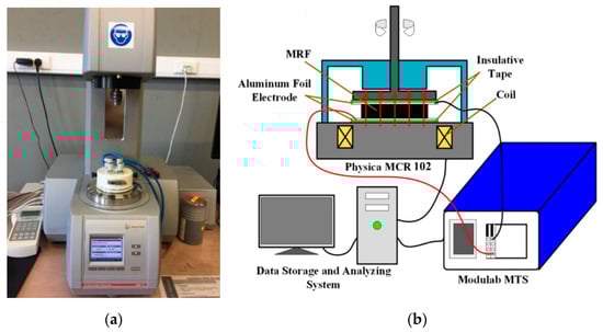 (a) MCR 102 rotational parallel plate rheometer equipped with a magnetic cell and (b) the corresponding schematic diagram.