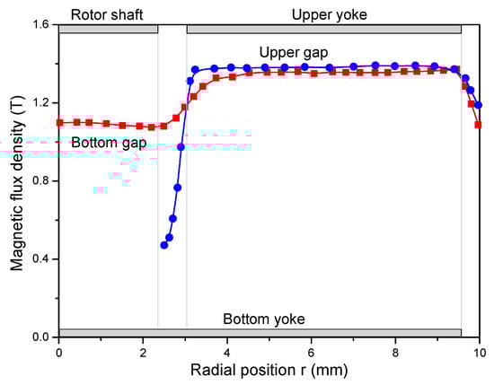 Simulated flux density profiles in the middle of the shear gaps filled by magnetorheological (MR) fluid at an input current of 3 A and gap of 1.1 mm [26].