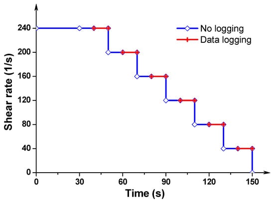After pouring the sample into the plate, a pre-shear procedure with shear rate of 100 s−1 was first applied for 30 s, and, then the sample was magnetized under an external magnetic field (0 T or 0.5 T) for 5 min. Afterwards, the sample was sheared at shear rate of 240 s−1 for 30 s to obtain a homogeneous state. The flow curve test protocol consists of decreasing the shear rate from 240 s−1 to 40 s−1 by six steps (i.e., 240 s−1, 200 s−1, 160 s−1, 120 s−1, 80 s−1 and 40 s−1), as presented in Figure 6. Each rotational shearing step lasted for 20 s, and only the last 10 s were used to record the data. The resulting six points of shear rate versus shear stress were fitted using the Bingham model (see Equation (1)) to calculate the rheological parameters.