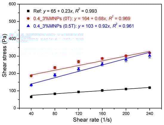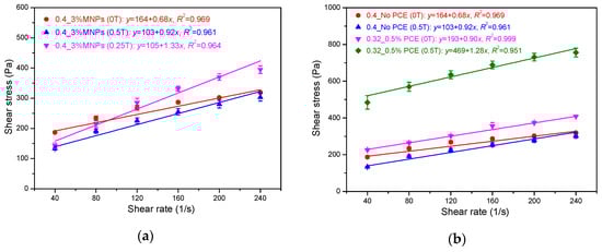 Rheological properties, with yield stress and plastic viscosity as two intrinsic physical parameters [16], are of great importance in describing flowability and workability, evaluating pumpability, and predicting formwork filling of cement-based materials. Wallevik et al. [17,18] stated that the rheograph of yield stress against plastic viscosity can be used to optimize the rheological properties of fresh concrete. Kwon et al. [19] illustrated that the rheological properties of the lubrication layer can be used to predict the flow rate of pumped concrete. Roussel et at. [19,20] pointed out that the numerical simulation of non-Newtonian fluids considering various rheological parameters was a valuable approach to determine the minimum flowability guaranteeing adequate formwork filling and acceptable stability. Moreover, the rheological properties can be used to optimize the flowability of 3D printing concrete, achieving a balance between pumpability, extrudability, and buildability [21,22]. Accordingly, active control of rheological properties is beneficial to advancing the casting technique of fresh concrete. In the case of MR fluids under an external magnetic field, the plastic viscosity can increase about 105–106 times and the field-induced yield stress increases to 100 kPa [9]. Furthermore, the shear stress of MR fluids generally shows a plateau behavior at relatively low shear rates, while at higher shear rates, the shear stress gradually increases with increasing shear rate [23,24,25] due to the equilibrium between the structural breakdown and the build-up of chain structures. For the flowing cementitious materials containing magnetic nanoparticles, however, the rheological behavior under external magnetic field is still not fully understood.