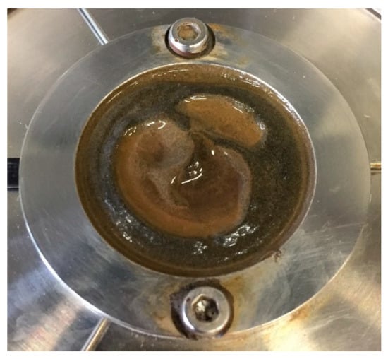 The effect of magnetic field on the flow curve of the cementitious paste (0.4_3%MNPs) is shown in Figure 7. The flow curve of pure cement paste with a w/c ratio of 0.4 (Ref) is also presented as a comparison. As expected, without an external magnetic field, the addition of nano-Fe3O4 particles increased the measured shear stress, yield stress, and plastic viscosity due to the high water demand of the nanoparticles as well as the increase in friction and collision between solid particles. Besides, the possible formation of small agglomerates of nanoparticles is also responsible for the increase in the rheological properties. After applying an external magnetic field of 0.5 T, the measured shear stresses were lower than that obtained without a magnetic field, especially at relatively low shear rates. As a result, comparing with the values obtained without magnetic field, lower yield stress and higher plastic viscosity were achieved in the presence of the external magnetic field of 0.5 T. This is totally different from the results of typical MR fluids [9,27,28], which show that dynamic yield stress significantly increases under an external magnetic field. In this study, this abnormal phenomenon can be explained by the distribution of nanoparticles in the cementitious suspensions during the rheological test. The surface of the cementitious paste after the rheological tests was checked, as shown in Figure 8. Apparent agglomeration and/or migration of nanoparticles as well as bleeding on the interface between the cementitious paste and the rotating upper plate can be observed. These phenomena possibly appeared after high-rate shearing during the flow curve test under the magnetic field. The agglomeration of nanoparticles and bleeding result in the cementitious paste having weaker structural strength [29,30], exhibiting low resistance to the applied shearing. Consequently, a high slope of the flow curve was obtained due to slippage, and thus, lower yield stress and higher plastic viscosity were observed compared to the cementitious paste with dispersed nanoparticles. In the following sections, the possible influencing factors and underlying mechanisms for the nanoparticle agglomeration and/or migration are examined and discussed.