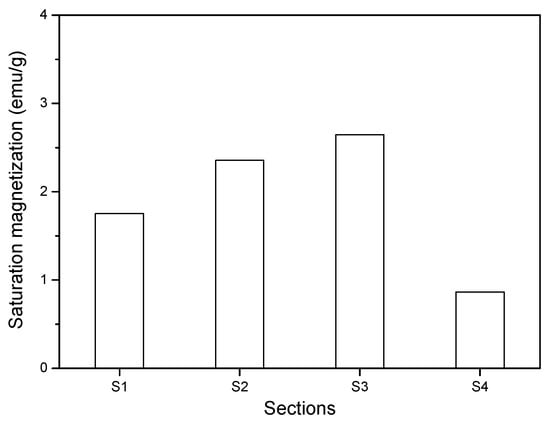 The saturation magnetization of the ground powders obtained from different sections of the sample disc in Figure 13 is plotted in Figure 14. It can be seen that the saturation magnetization of the powder in S4 was much lower than that in other sections, indicating that the paste disc in S4 contains the lowest concentration of nano-Fe3O4 particles. This can be due to the low magnetic flux density, low curvature, and high shear rate in S4. The saturation magnetization in S3 was larger than that in S1 and S2. Despite the hypothesis assuming that magnetic clusters should migrate radially inward from the periphery to the inner sections of the plate, a relatively high number of nanoparticles in S3 compared to S2 can be attributed to the fact that an absolutely large amount of nanoparticles migrates away from S4. Another possible reason is that the short period of high-rate shearing is not sufficient for the nanoparticles and clusters to migrate to inner sections. Moreover, the saturation magnetization in S1 was slightly lower than that in S2 probably due to the adverse magnetic force gradient and curvature gradient playing more significant roles than the shear rate gradient, resulting in the nanoparticles adversely migrating from S1 to S2.