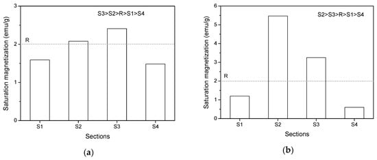 As aforementioned, under the combination of magnetic field and shearing, a large number of nanoparticles migrated from S4 to S3 and the short period of high-rate shearing resulted in a higher nanoparticles concentration in S3. To verify this statement, VSM measurement of the cementitious paste powders in the parallel plate with a gap of 1 mm after experiencing constant shearing with different rates (in the presence of 0.5 T magnetic field) was performed. Figure 15a,b shows the saturation magnetization of cementitious powders in the four sections after exposure to a constant shear rate of 40 s−1 (low-rate) and 240 s−1 (high-rate) for 120 s, which is similar to the duration of the rheological test. A reference cementitious paste with a w/c ratio of 0.4 and MNPs of 3% without experiencing any shearing test and magnetic field was also prepared, and the saturation magnetization of the powder obtained from this paste was determined by VSM as a comparison, as presented in the dash line (R) in Figure 15. As expected, the saturation magnetization in S3 was the highest after experiencing the low-rate shearing due to insufficient shearing. By contrast, the high-rate shearing action with the same duration resulted in a significant high-saturation magnetization in S2. This indicates that most of the magnetic nano-Fe3O4 particles accumulated in S2 after experiencing a sufficiently long period of high-rate shearing. The saturation magnetization values in S2 and S3 after high-rate shearing were higher than that in the same sections after low-rate shearing, whereas the magnetization values in S1 and S4 showed opposite behavior. This can be attributed to the facilitation effect of high-rate shearing to the migration of nanoparticles. Interestingly, the saturation magnetization of the reference cement paste was lower than that in S2 and S3 but higher than that in S1 and S4, regardless of the shear rate. This supports the nanoparticle migration from S4 to the inner zones as well as the adverse migration of nanoparticles from S1 to S2. The VSM experimental results provide a solid argument for the nanoparticle distribution in the parallel plates under the combination effect of magnetic field and rotational shearing.