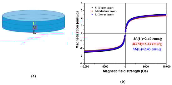 Furthermore, the distribution of magnetic nanoparticles along the height of the paste disc was also examined. For this aim, a cementitious paste disc with thickness of 2 mm was prepared after the rheological tests under an external magnetic field of 0.4 T, which is the maximum reachable magnetic field strength of the used rheometer at a gap distance of 2 mm. The sample preparation process was similar to that of the samples with 1 mm. Once hardened, the paste disc was ground into three layers in the vertical direction, as shown in Figure 16a. The VSM experimental results of the corresponding ground powders are presented in Figure 16b. It can be seen that the saturation magnetization exhibited insignificant difference among the three vertical layers. This means that the nanoparticle migration in the vertical direction is not pronounced. In other words, the nanoparticle migration only occurs on the upper layer of the cementitious paste in the parallel plate. It can be concluded that the VSM results of different sections and layers are in good agreement with the proposed hypothesis.