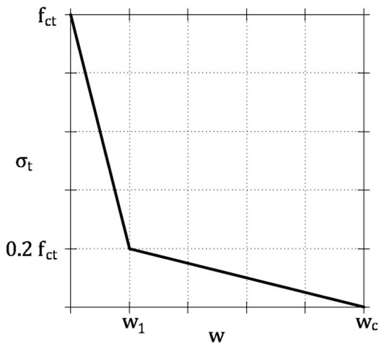 Both steel fiber and uncracked matrix are assumed in the linear elastic regime, whereas the cohesive stresses on the crack surfaces of the ideal tie are defined by the fictitious crack model shown in Figure 4. It consists of a bilinear stress vs. crack width relationship, σt-w, as proposed by Model Code 2010 [20]