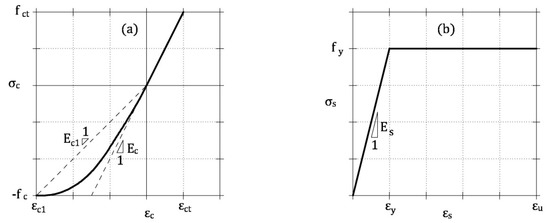 In uncracked concrete, linear elastic constitutive law is assumed in tension, whereas the ascending branch of the Sargin’s parabola [20] is the σc-εc relationship in compression (Figure 5a)