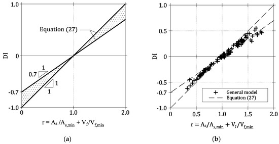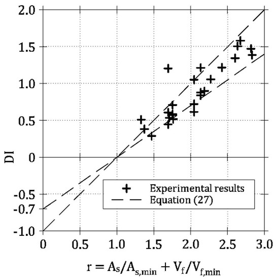 As in the case of LRC and FRC beams, within each group of beams (e.g., those of Group 9 in Figure 7), a linear relationship between DI and r is attained (see Figure 7b) and the intersection between the line DI-r and the horizontal axis (i.e., DI = 0) occurs when r ≅ 1, corresponding to the minimum hybrid reinforcement. Thus, the following symbolic equation can be written